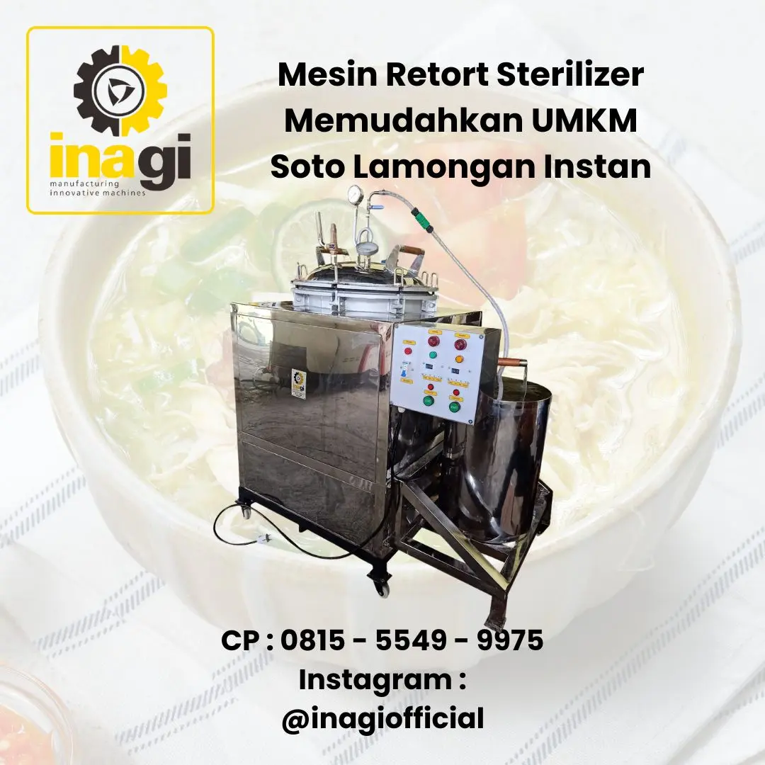 Mesin retort sterilizer merupakan alat sterilisasi yang menggunakan tekanan tinggi dan suhu panas untuk membunuh bakteri serta mikroorganisme yang dapat menyebabkan pembusukan makanan. Dengan teknologi ini, soto Lamongan instan dapat diproduksi dalam skala besar tanpa mengurangi kualitas rasa dan aroma khasnya. Proses sterilisasi dengan mesin retort juga memastikan bahwa produk tetap higienis dan sesuai standar keamanan pangan.