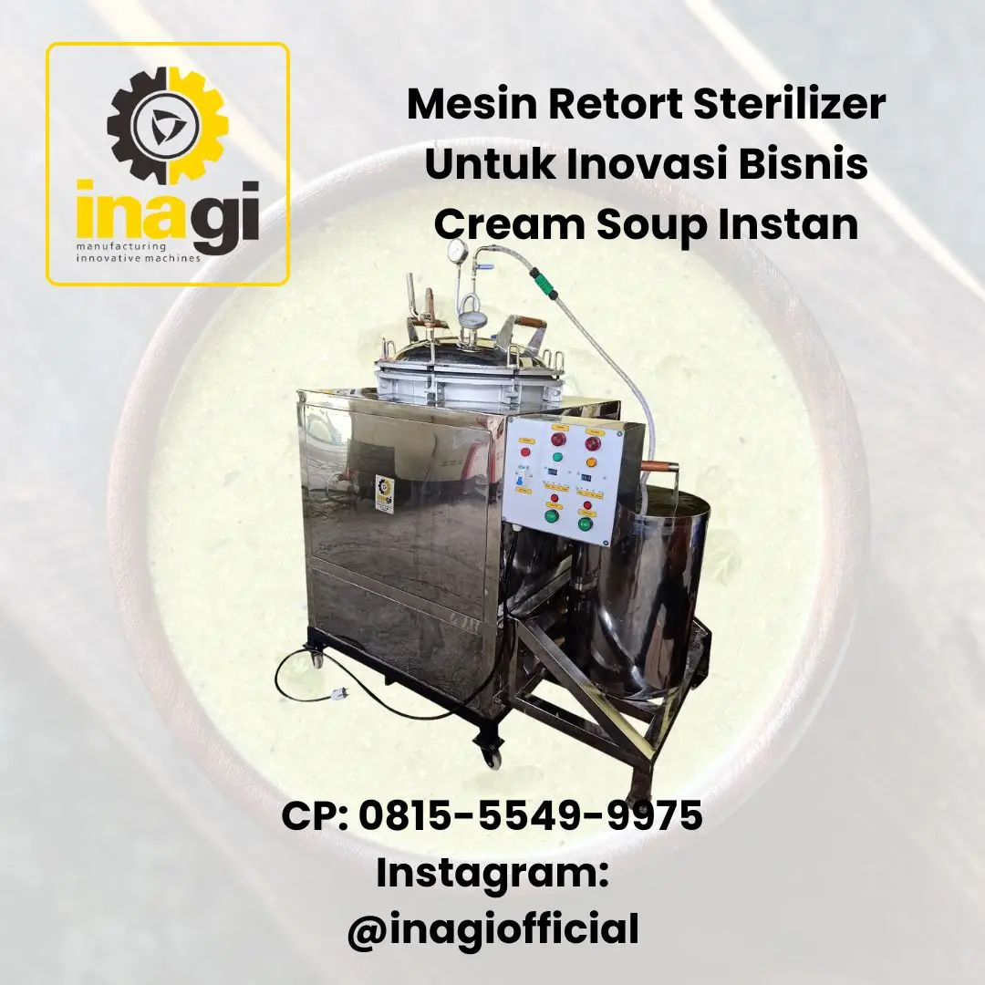 Mesin retort Inagi merupakan salah satu produk lokal yang dirancang khusus untuk kebutuhan industri makanan skala kecil hingga menengah. Mesin ini mampu menyesuaikan waktu dan suhu sterilisasi sesuai jenis produk, sehingga sangat cocok untuk cream soup yang memiliki tekstur halus dan sensitif terhadap suhu tinggi berlebih.